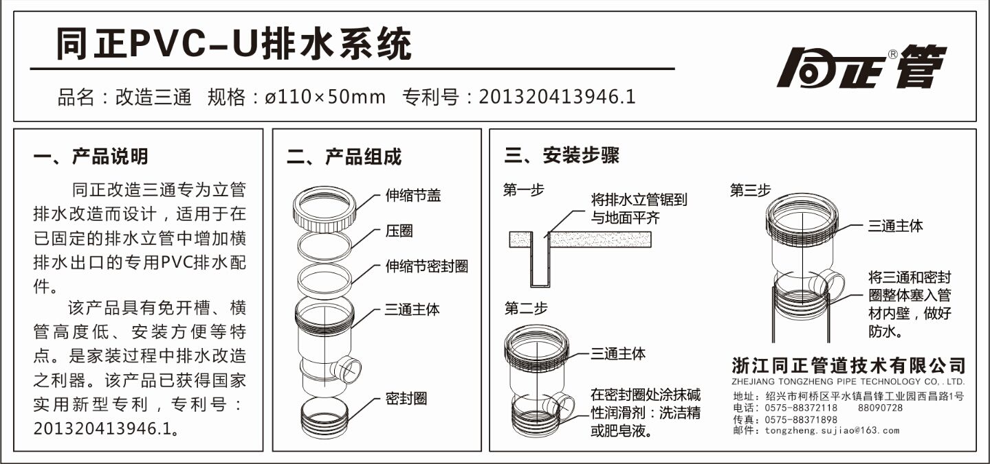 同正新品:改造三通即將于2015年11月底上市。該產(chǎn)品專為立管排水改造而設(shè)計(jì),適用于在已固定的排水立管中增加橫排水出口的專用PVC排水配件。